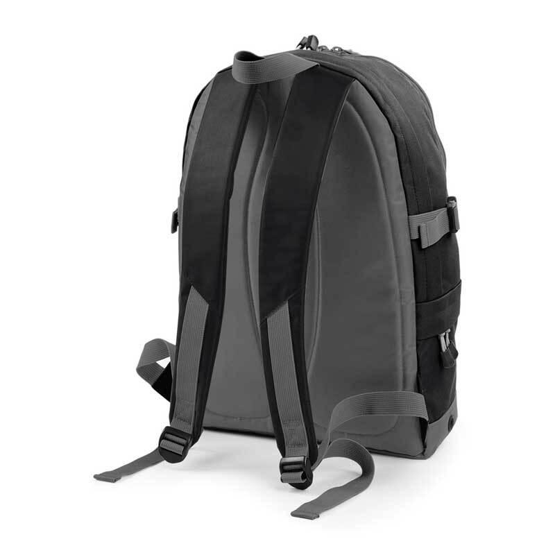 Rum til vådt håndklæde. Kompressionsstropper. Polstret bagpanel. Organiseringsrum. Elastisk flaskestrop. Metalventilationsøjer. Gribehåndtag.